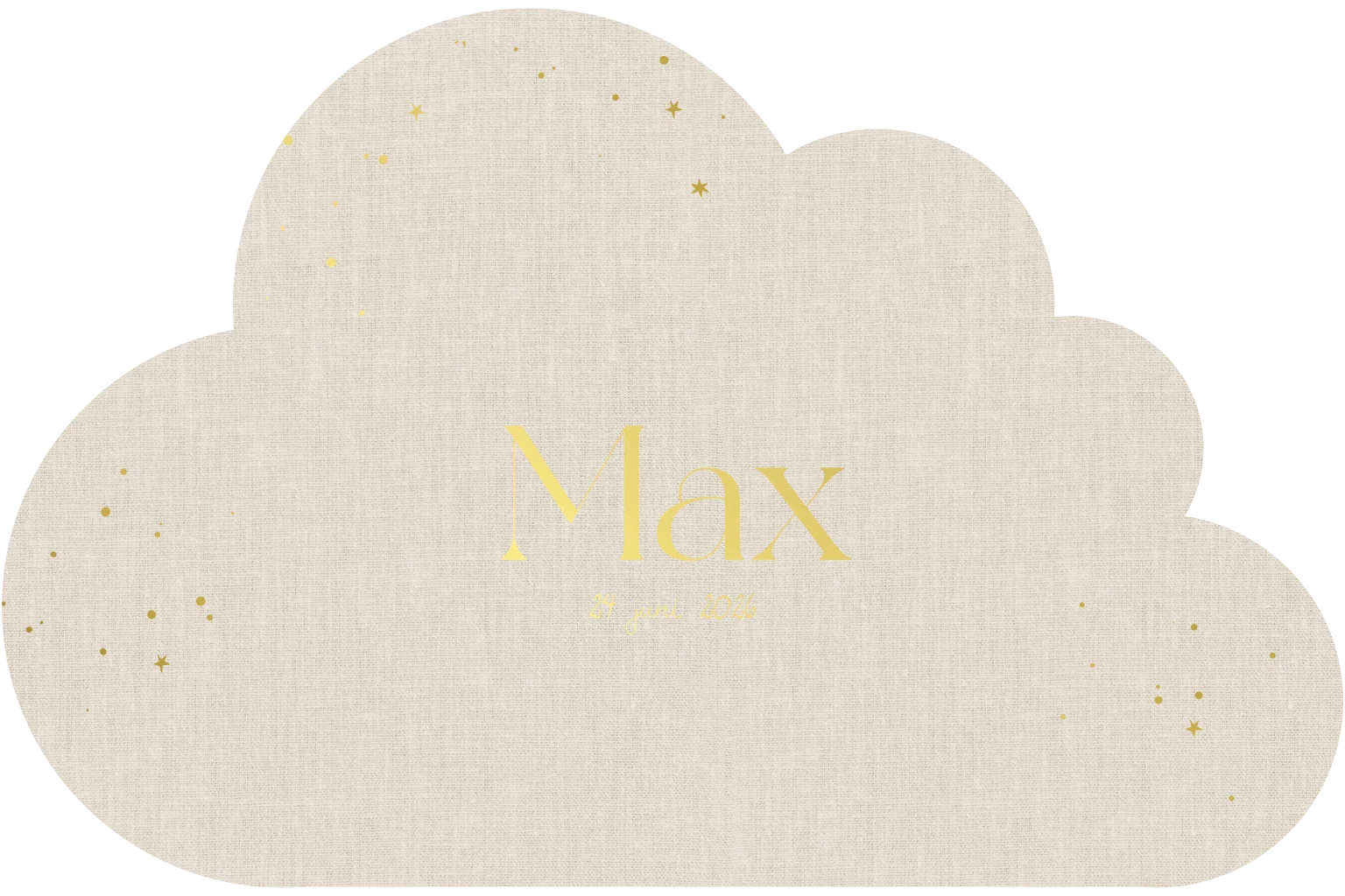 Een warm en tijdloos geboortekaartje in de vorm van een wolk, met een zachte beige kleur en linnenstructuur als achtergrond. Perfect voor een rustige, natuurlijke en stijlvolle aankondiging van jullie baby. Max