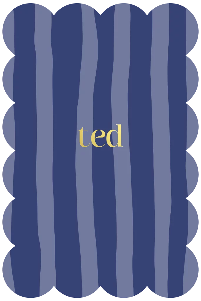 Dit stijlvolle geboortekaartje in klassieke blauwe strepen heeft een speelse golfrand en luxe goudfolie accenten. Een perfecte keuze voor ouders die een tijdloos en elegant ontwerp zoeken. Ted