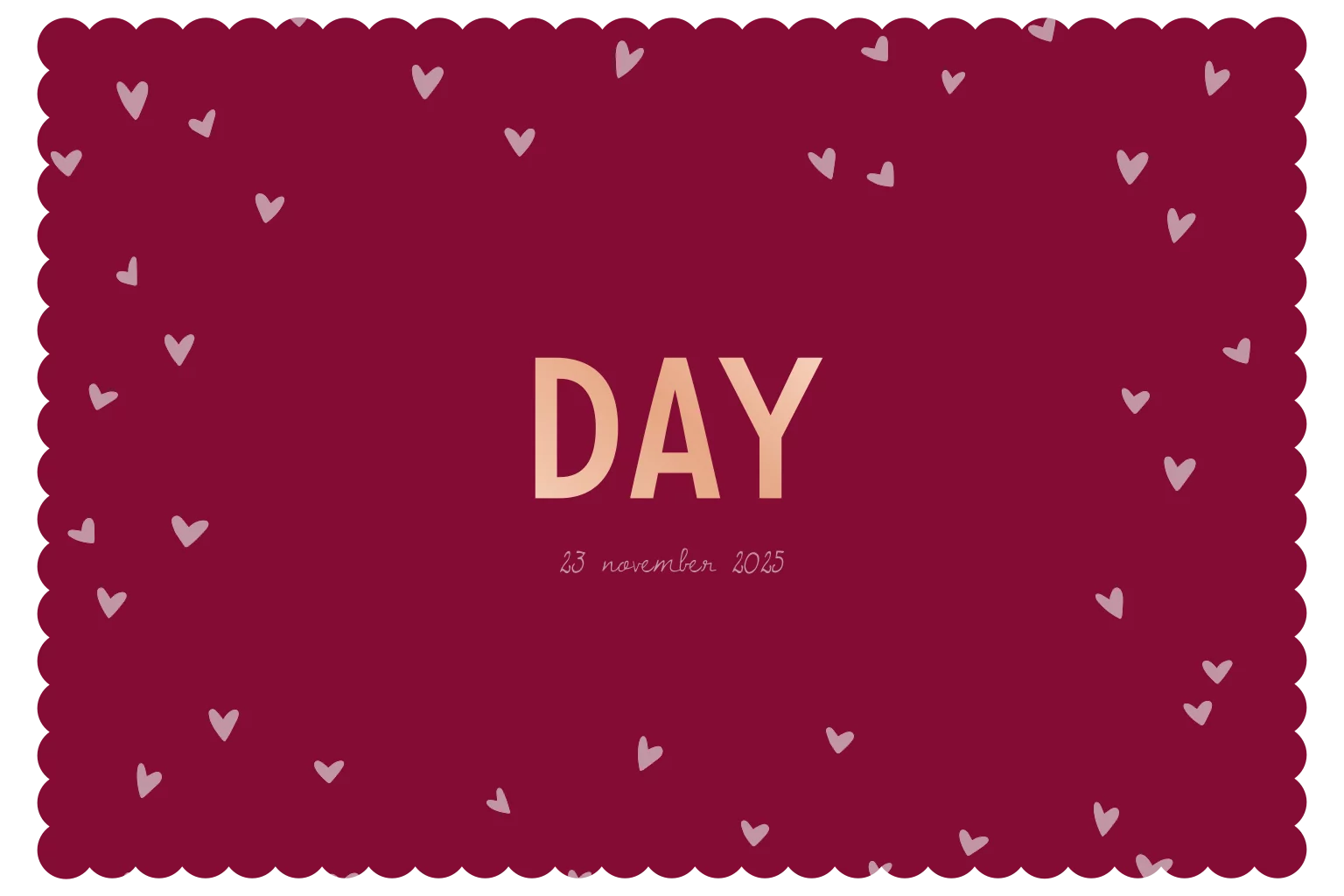Een stijlvol en warm geboortekaartje in bordeauxrode tinten met een elegante kartelrand en lieve roze hartjes. Perfect voor ouders die een romantisch en klassiek ontwerp zoeken. Day