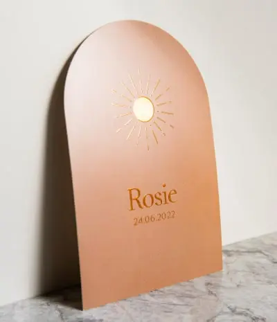 Hoe gaaf is dit geboortekaartje in deze unieke boogvorm? Met een mooie, bruine waterverf achtergrond en afgewerkt met een zon in folie.