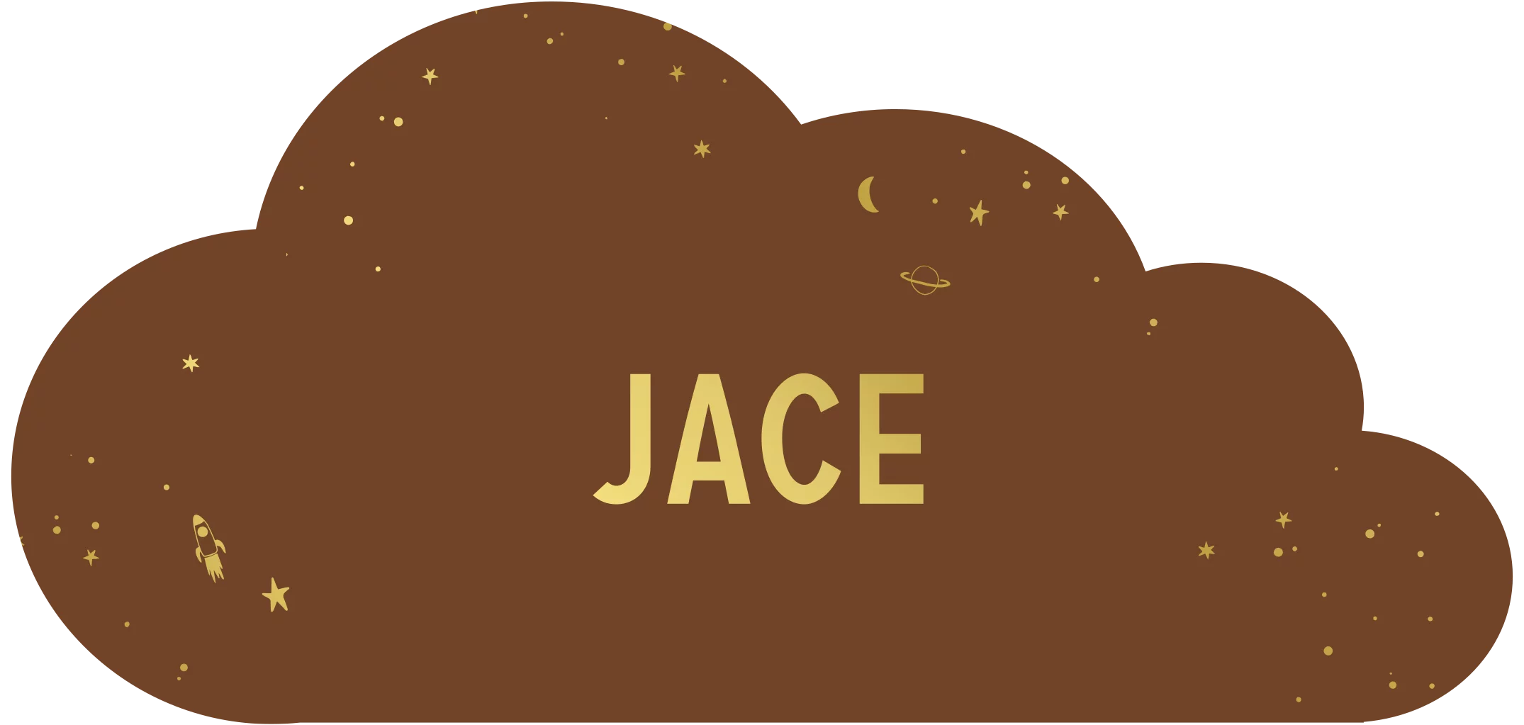 Een bijzonder geboortekaartje in de vorm van een wolk, met een diepe bruine kleur en illustraties van sterren en ruimte-elementen. Perfect voor een dromerige aankondiging. Jace