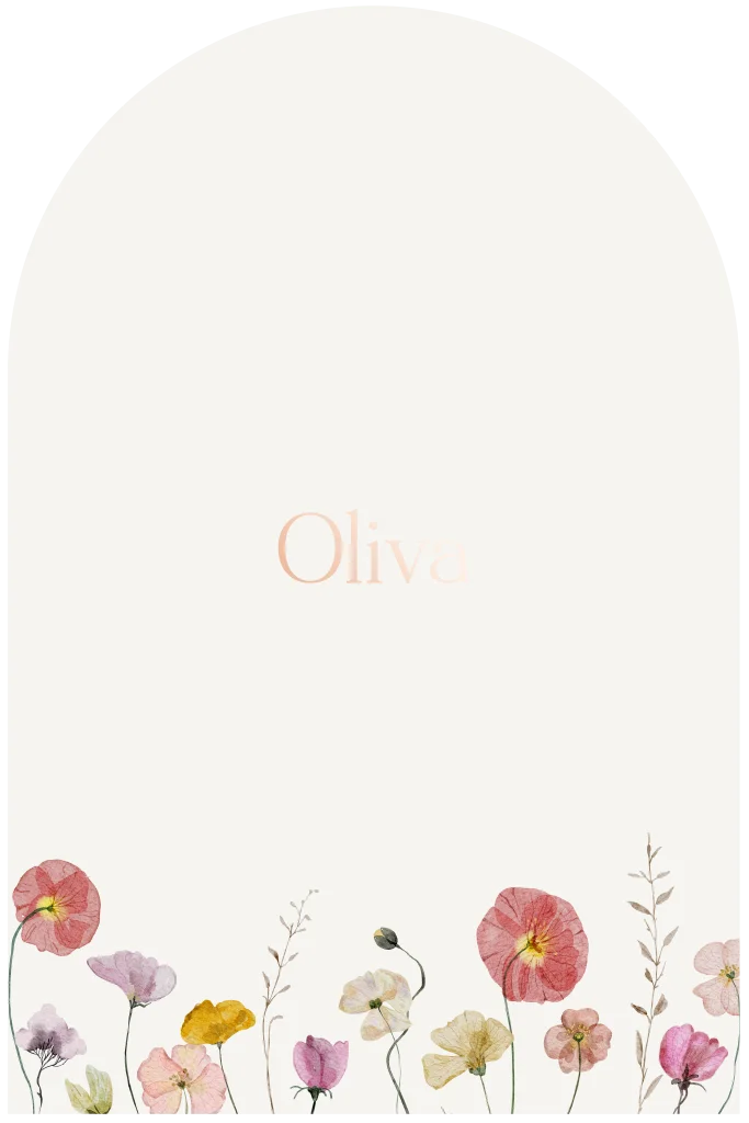 Een elegant geboortekaartje in boogvorm, met onderaan een prachtige bloemenrand en afgewerkt met luxe roségouden folie. Stijlvol en stralend, ideaal voor een sprankelende aankondiging van jullie kleintje!