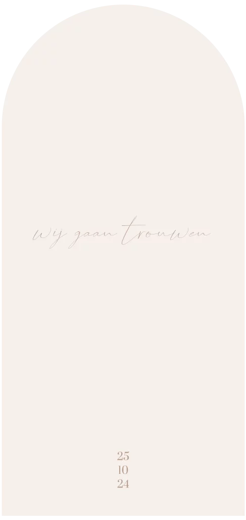 Deze elegante uitnodigingskaart voor jullie bruiloft is net even anders dan anders. Met zijn unieke boogvormige ontwerp springt deze kaart meteen in het oog. Het is de perfecte kaart om jullie gasten op een stijlvolle manier uit te nodigen voor jullie huwelijksfeest. Het ontwerp is klassiek en tijdloos, maar toch heel eigentijds door de bijzondere vorm. De uitnodiging is gedrukt op hoogwaardig papier en heeft een luxe uitstraling, waardoor jullie gasten meteen voelen hoe bijzonder jullie dag gaat worden. De kaart is volledig aan te passen in de online editor, zodat het ontwerp helemaal past bij jullie persoonlijke smaak en stijl. Kies de kleuren, teksten en lettertypes die bij jullie passen en creëer zo een uniek ontwerp dat precies laat zien wie jullie zijn en wat jullie willen uitstralen op jullie grote dag. Nodig jullie geliefden uit in stijl en laat ze alvast meegenieten van de spanning en romantiek die hoort bij een huwelijk. Met deze elegante uitnodigingskaart in boogvorm kunnen jullie niet anders dan een blijvende indruk achterlaten.