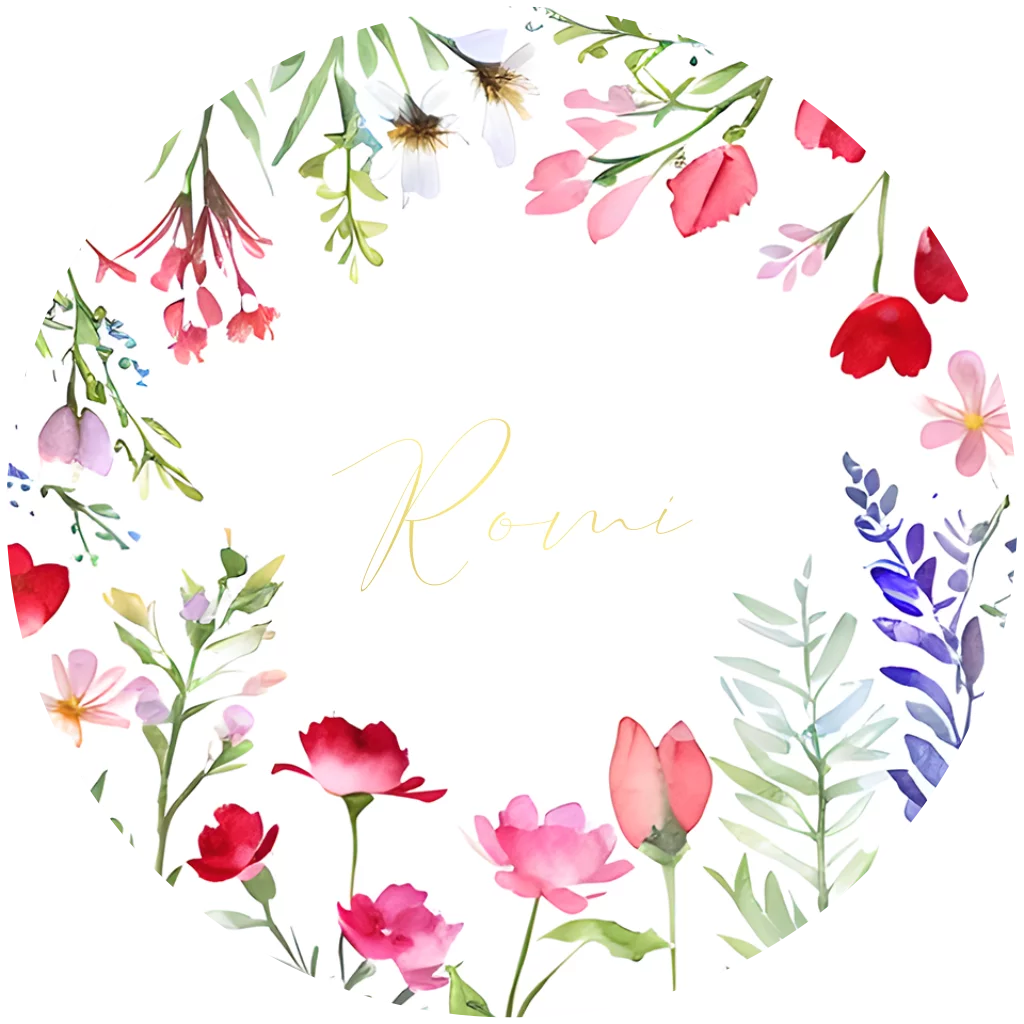 Dit moderne geboortekaartje is uitgesneden in een ronde vorm. Een geboortekaartje voor meisjes met een fleurige bloemenrand en de naam in goudfolie. De achtergrond, het lettertype en de kleuren zijn volledig naar wens aan te passen. Heb je hulp nodig bij het ontwerpen van jouw ideale kaartje? Stuur gerust een berichtje! Romi