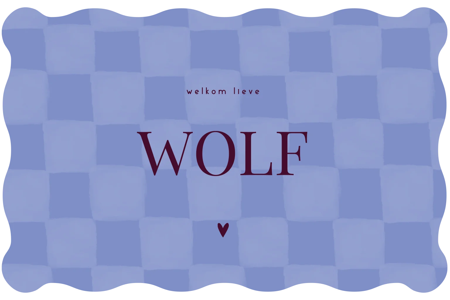 Fris blauw kaartje met ruitjes, een speelse golfrand en de naam in bordeaux. Stoer en vrolijk samen. Pas het ontwerp naar wens aan in de editor. Heb je hulp nodig? Stuur me gerust een berichtje, ik help je graag! Wolf