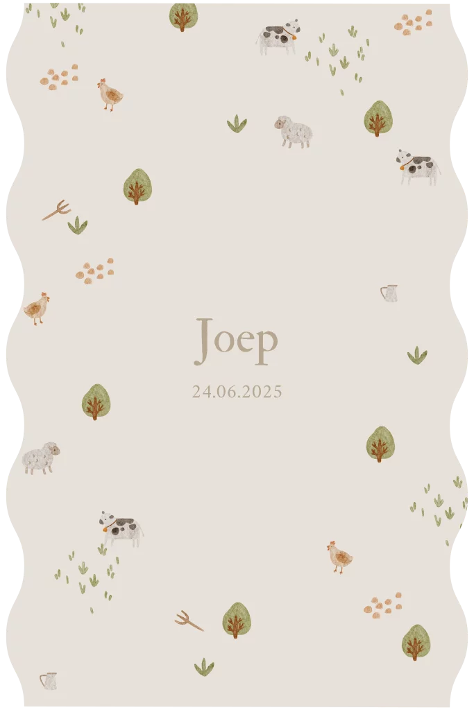 Een lief geboortekaartje met allemaal boerderijdieren en een speelse golfrand. Gezellig én schattig. Joep