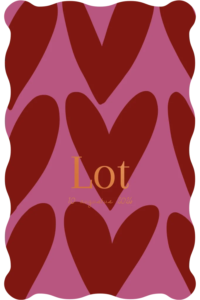 Warm geboortekaartje in bordeaux en roze met hartjes en een golfrand. Gezellig en vrolijk. Pas het ontwerp naar wens aan in de editor. Heb je hulp nodig? Stuur me gerust een berichtje, ik help je graag! Lot