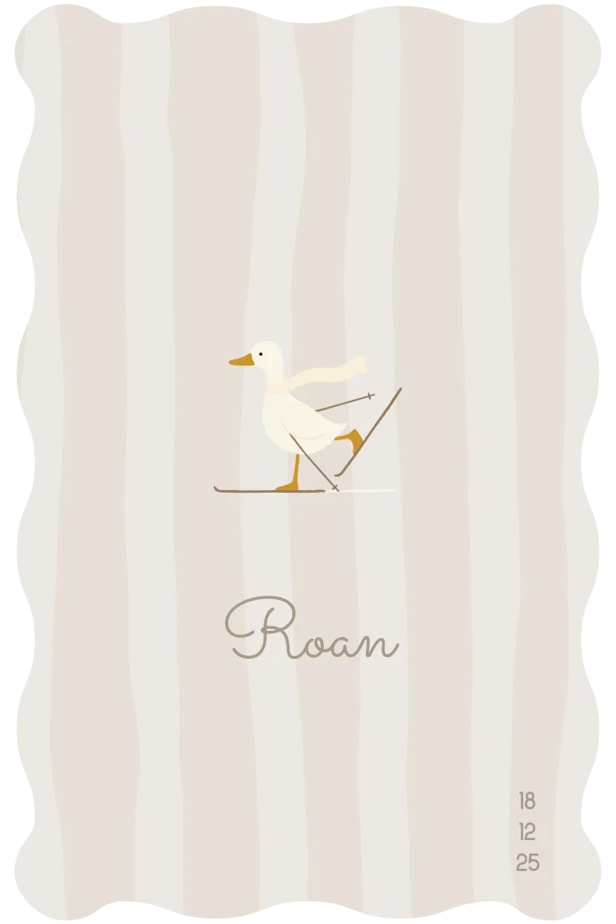 Geboortekaartje met golfrand, strepen en eend op ski’s