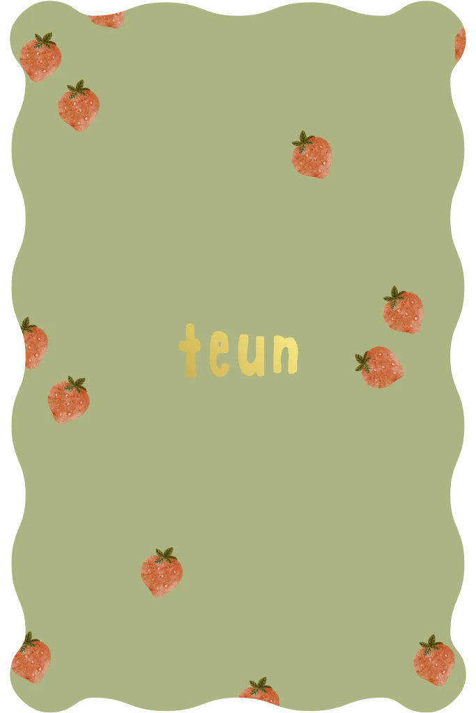 Een frisgroen kaartje met aardbeitjes en een mooie golfrand. Lekker vrolijk en zomers. Teun