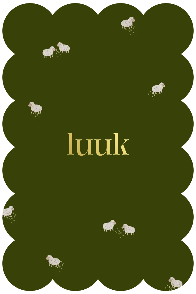 Dit groene kaartje met een kartelrand en zachte schaapjes is superlief en knus. Perfect voor een klein lammetje. Luuk