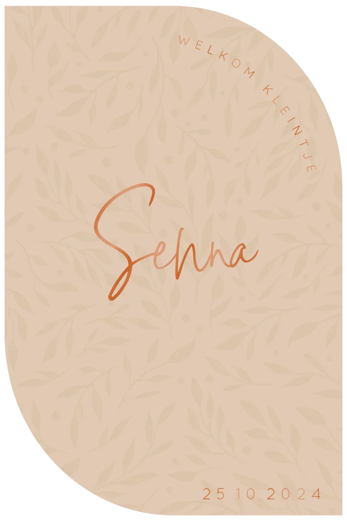 Welkom kleintje. Hoe gaaf is dit geboortekaartje in unieke vorm? Met een mooie, subtiele bloemenachtergrond en afgewerkt met koperfolie. De achtergrond, het lettertype en de kleuren zijn ook volledig naar wens aan te passen. Heb je hulp nodig bij het ontwerpen van jouw ideale kaartje? Stuur gerust een berichtje! Senna