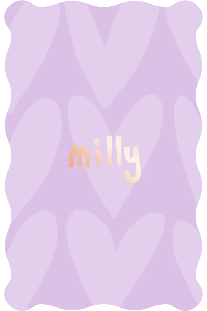 Zacht lila geboortekaartje met een achtergrond vol hartjes en een golfrand. Lief en speels. Pas het ontwerp naar wens aan in de editor. Heb je hulp nodig? Stuur me gerust een berichtje, ik help je graag! Milly
