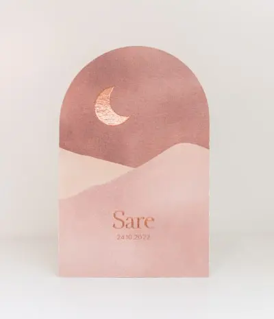 Hoe mooi is dit kaartje met bergen in terracotta kleur en de maan in koperfolie? Dit kaartje is zowel voor jongens als voor meisjes. De achtergrond, het lettertype en de kleuren zijn volledig naar wens aan te passen. Heb je hulp nodig bij het ontwerpen van jouw ideale kaartje? Stuur gerust een berichtje! Sare
