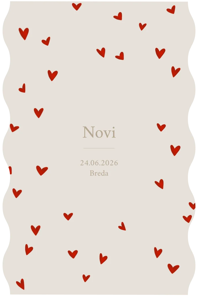 Verras vrienden en familie met dit schattige geboortekaartje! Het ontwerp is versierd met vrolijke rode hartjes en heeft een speelse golfrand, wat het kaartje een unieke uitstraling geeft. Perfect voor het verwelkomen van jullie kleine wonder. Op de binnenzijde is er ruimte voor persoonlijke tekst en details, zodat jullie deze bijzondere gebeurtenis op een liefdevolle manier kunnen delen. Maak de aankondiging van jullie nieuwe gezinslid extra bijzonder met dit stijlvolle kaartje! Novi
