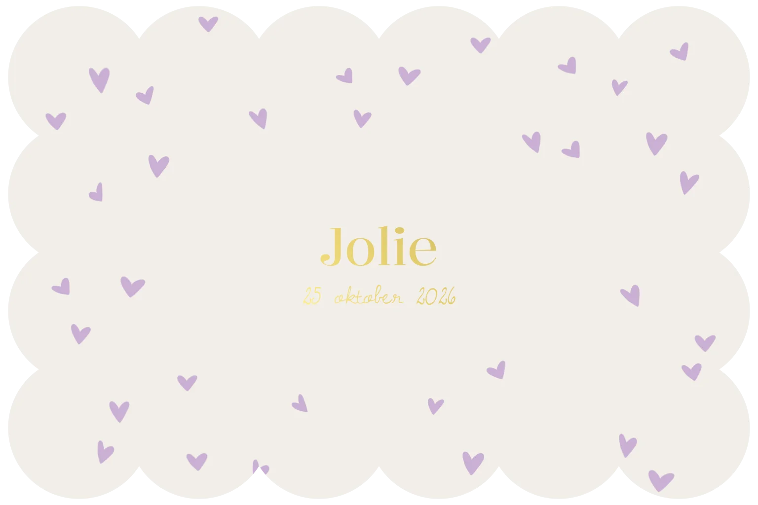 Een lief en speels geboortekaartje met een golvende rand en schattige lila hartjes. Een zachte en vrolijke manier om jullie kleintje aan te kondigen. Jolie
