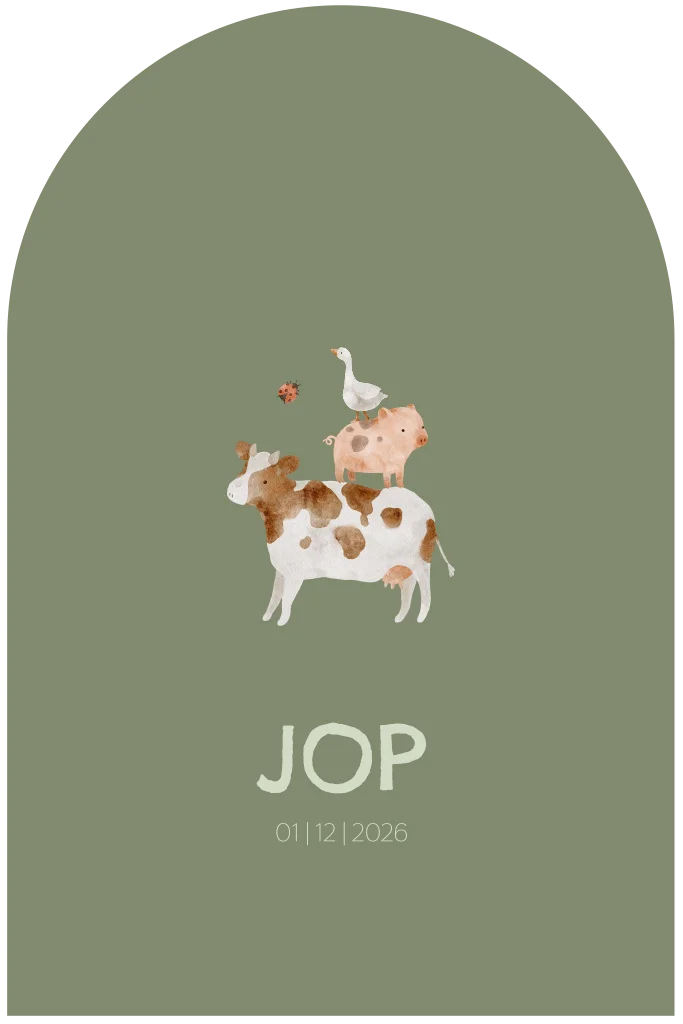Dit geboortekaartje is een feestje voor boerderijfans! Het groene boogontwerp zit vol vrolijke boerderijdieren en speelse details. Perfect voor een gezellig en warm welkom voor je kleintje, met een knipoog naar het buitenleven.