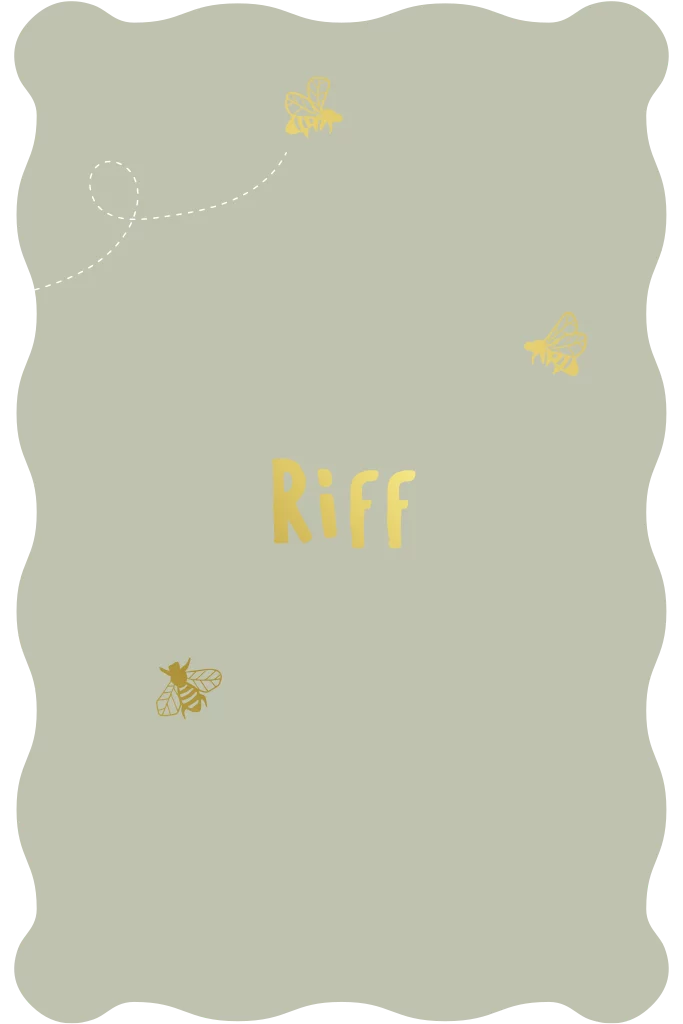 Een vrolijk geboortekaartje in lichtgroene tinten, versierd met schattige bijtjes in glanzende goudfolie en een speelse golfrand. Een frisse en levendige keuze. Riff