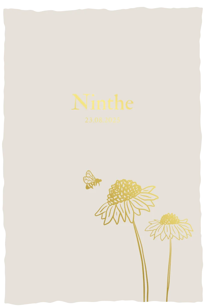 Ontdek ons prachtige geboortekaartje met een lieflijke scheprand, betoverende bloemen en een schattig bijtje. Dit kaartje is perfect om de komst van jullie kleintje aan te kondigen en laat zien hoe blij jullie zijn met jullie kleine wonder. De subtiele foliedruk in goud geeft een luxe uitstraling aan het kaartje en voegt een vleugje romantiek toe. Met zijn zachte beige tinten en bloemen in goudfolie ademt dit kaartje de sfeer van de lente en is het ideaal voor ouders die willen uitstralen hoeveel liefde ze voelen voor hun dochter. Het is ontworpen om de eerste glimlachen en knuffels uit te lokken, waardoor het een blijvende herinnering zal worden voor iedereen die het ontvangt. Of het nu voor een jongen of meisje is, dit kaartje straalt elegantie en stijl uit en zal zeker indruk maken op de ontvangers. Kies voor dit kaartje en laat de aankondiging van jullie speciale gelegenheid een blijvende indruk achter! Ninthe