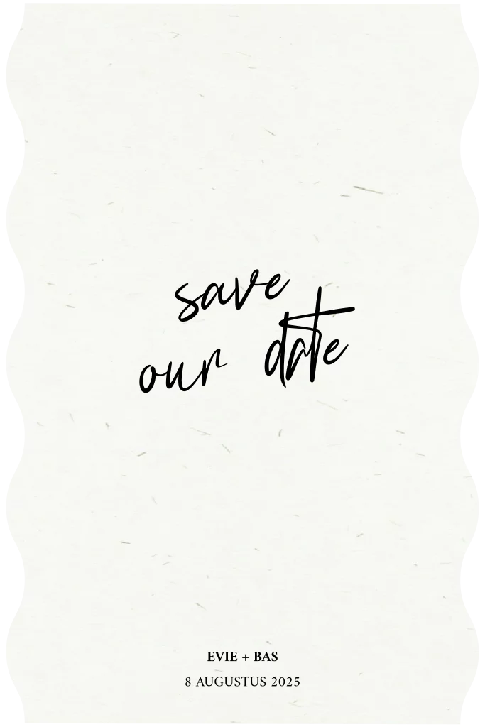 Deze minimalistische save the date kaart is perfect voor koppels die op zoek zijn naar een subtiele maar stijlvolle manier om hun gasten op de hoogte te brengen van hun aankomende bruiloft. De kaart heeft een elegante golfrand en een minimalistisch ontwerp met alleen de belangrijkste informatie, zoals de namen van het bruidspaar en de datum van de bruiloft. Door de eenvoudige en tijdloze uitstraling past deze kaart bij elke bruiloftsthema. Je kunt de kaart aanpassen naar jouw wensen, bijvoorbeeld met de keuze uit verschillende lettertypen en kleuren voor de tekst en de golfrand.