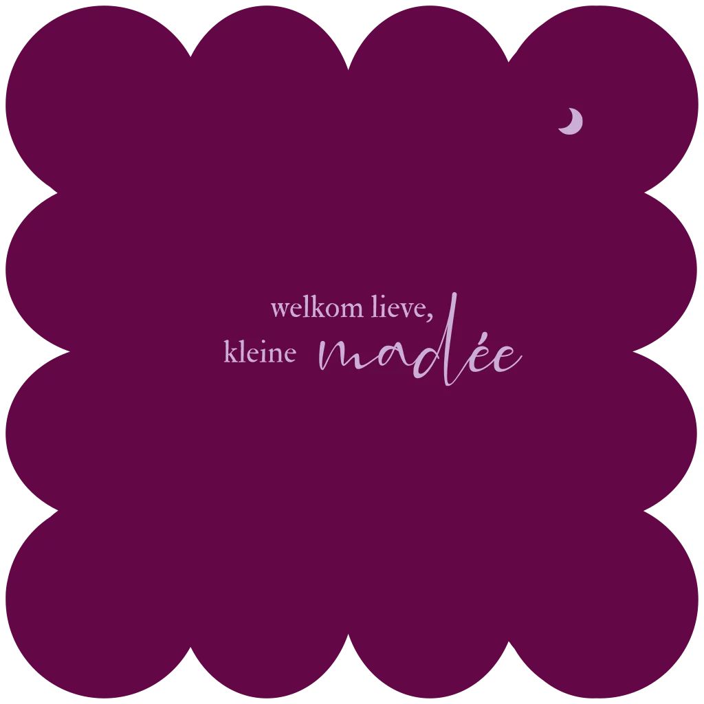Ben je op zoek naar een uniek paars geboortekaartje met een vleugje luxe en originaliteit? Zoek niet verder! Ons paarse geboortekaartje met een speelse golfrand en een schattig maantje is precies wat je nodig hebt om de komst van jullie kleintje aan te kondigen. Dit geboortekaartje is perfect voor moderne ouders die op zoek zijn naar iets bijzonders om de geboorte van hun mini-me te vieren. De paarse kleur straalt elegantie uit, terwijl de stans van de golfrand en het kleine maantje een speels tintje toevoegen. Het resultaat is een geboortekaartje dat zowel stijlvol als schattig is, ideaal voor ouders die trots willen pronken met hun kleintje. Met dit kaartje weet je zeker dat je opvalt tussen de rest. Of je nu van paarse details houdt of op zoek bent naar een luxe uitstraling, dit paarse geboortekaartje past perfect bij jullie wensen. Dus, als je op zoek bent naar een uniek en opvallend geboortekaartje om de komst van jullie kindje aan te kondigen, dan is ons paarse geboortekaartje met golfrand en maantje de perfecte keuze. Bestel vandaag nog en maak de aankondiging van jullie kleintje extra speciaal! Madee / Madée