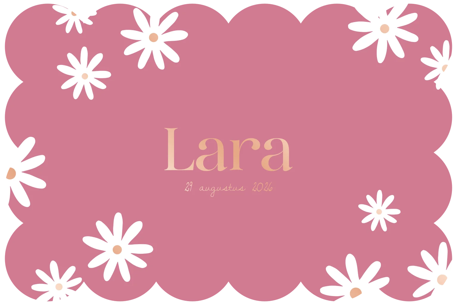 Dit roze geboortekaartje met een sierlijke golfrand en fijne bloemenillustraties straalt pure liefde en zachtheid uit. Een tijdloos ontwerp voor een warme en speelse geboorteaankondiging. Lara