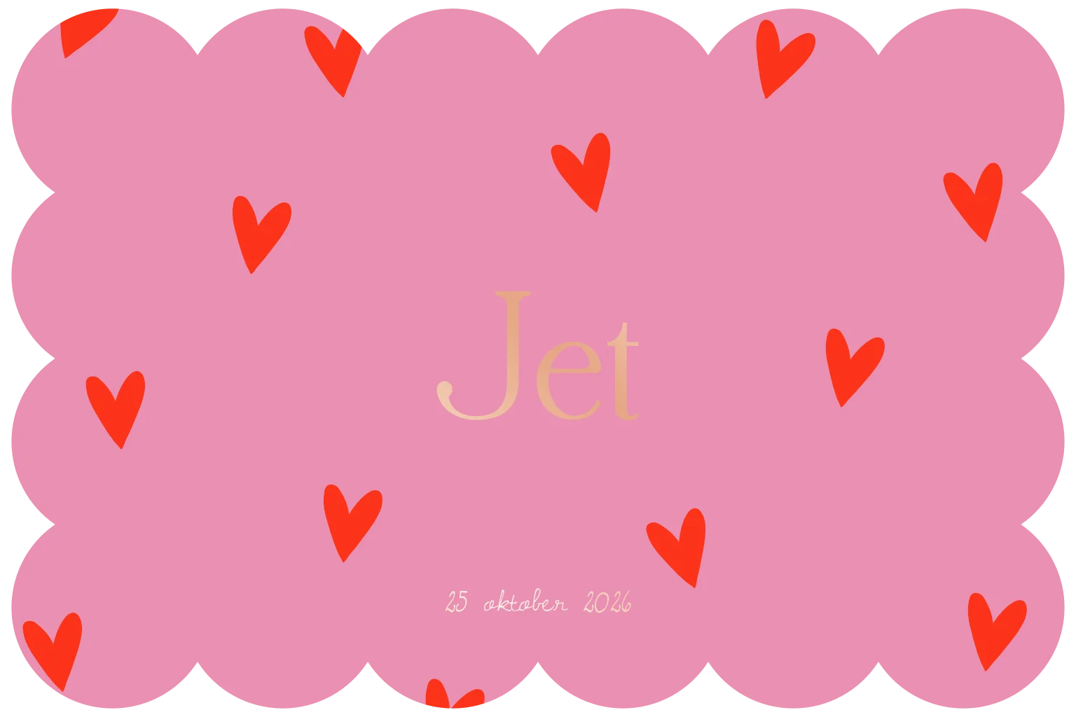 Maak de geboorte van je kleintje extra bijzonder met ons mooie geboortekaartje. Het kaartje heeft een leuke golfrand en is versierd met vrolijke hartjes. Jet