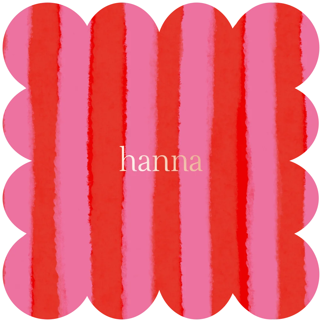Dit roze met rood gestreepte kaartje, afgewerkt met een sierlijke golfrand, straalt liefde en vrolijkheid uit. De gave kleurencombinatie maakt het kaartje perfect voor de aankondiging van jullie bijzondere gebeurtenis. De ruimte aan de achterkant biedt genoeg plaats voor de naam, geboortedatum en andere persoonlijke gegevens. Laat jullie liefde schitteren met dit colorblocking geboortekaartje en deel het mooie nieuws met vrienden en familie op een unieke manier. Hanna