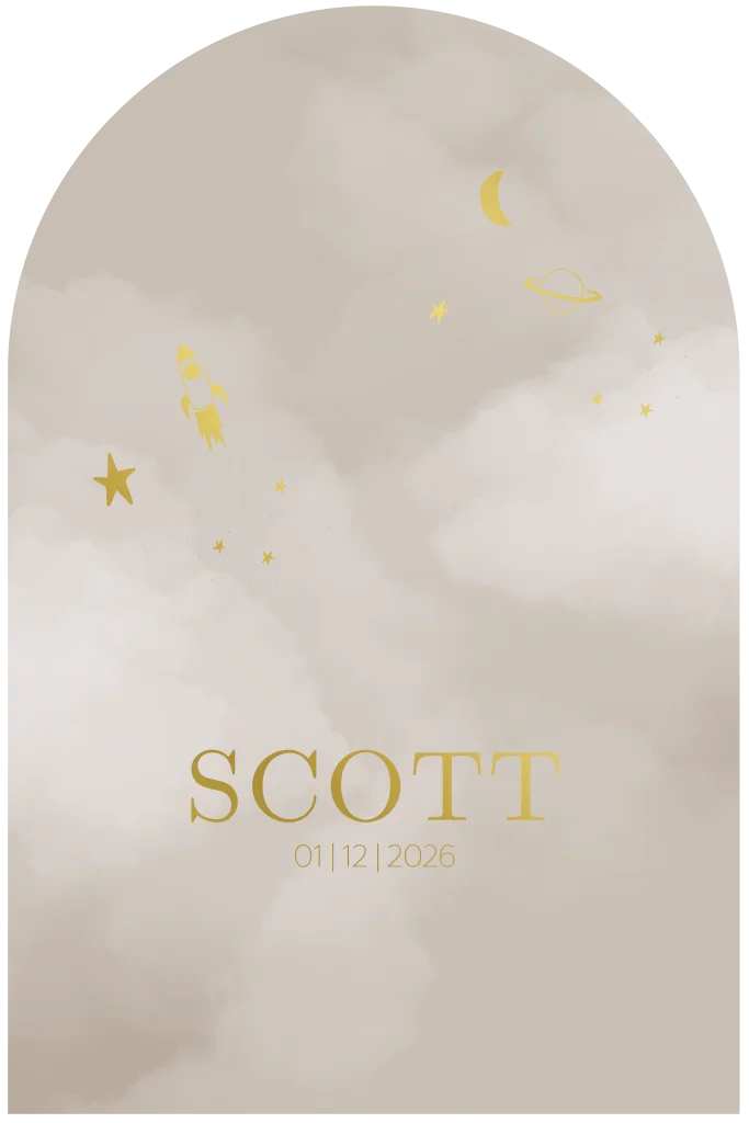 Dit bijzondere geboortekaartje in boogvorm heeft een magisch ruimte-thema. Personaliseer het met de naam van je baby en vier een avontuurlijke geboorte met sterren, planeten en fantasierijke illustraties. Scott