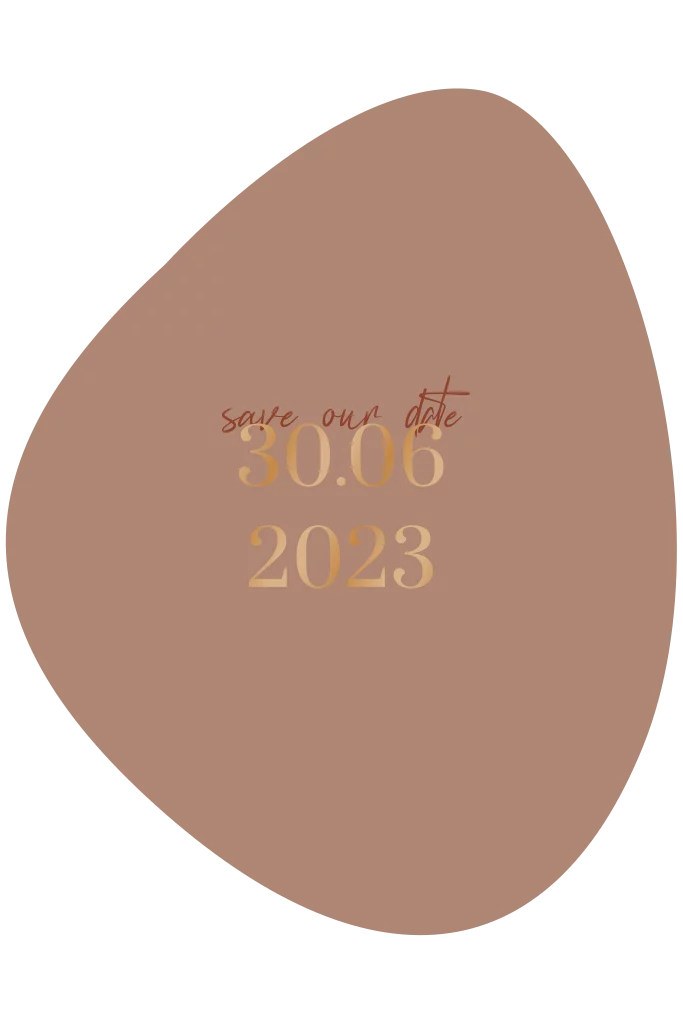 Maak een bijzondere indruk op jullie gasten met onze unieke organische Save the Date kaart in een warme bruine kleur met prachtige koperfolie details. De organische vorm van de kaart zorgt voor een speelse en unieke uitstraling die perfect past bij koppels die houden van originaliteit en creativiteit. De koperfolie details van de datum geven de kaart een elegante en luxe uitstraling die jullie speciale dag extra feestelijk maken. Personaliseer de kaart met jullie eigen tekst om de aankondiging nog persoonlijker te maken. Bij deze Save the Date kaart hebben we ook een bijpassende trouwkaart in dezelfde stijl en kleurencombinatie, zodat jullie de look en feel van jullie uitnodigingen kunnen behouden. De organische vorm en warme kleur van deze kaarten passen perfect bij een herfst- of winterbruiloft, maar kunnen natuurlijk het hele jaar door gebruikt worden. Bestel deze unieke organische Save the Date kaart en bijpassende trouwkaart vandaag nog en laat jullie gasten alvast meegenieten van jullie speciale dag!