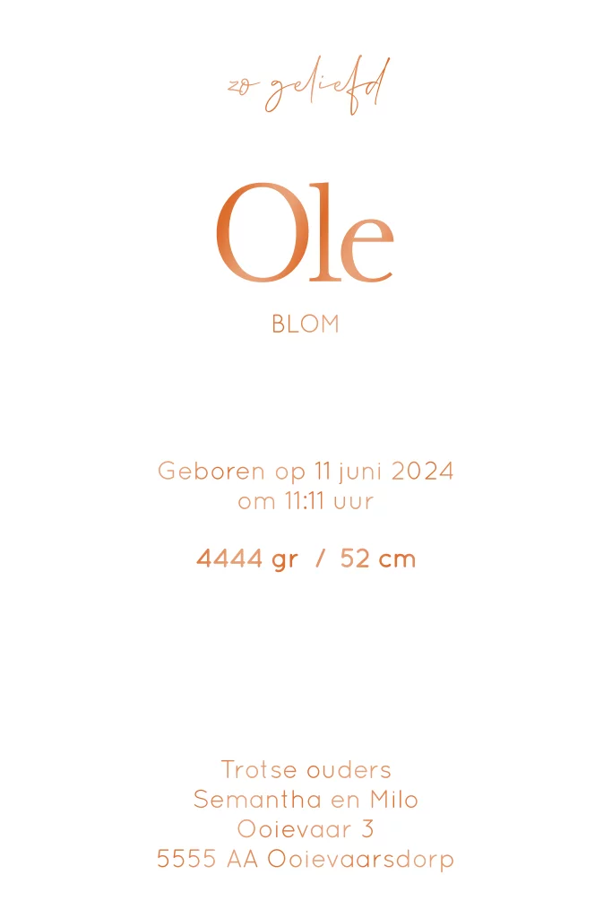De achtergrond, het lettertype en de kleuren zijn ook volledig naar wens aan te passen. Heb je hulp nodig bij het ontwerpen van jouw ideale kaartje? Stuur gerust een berichtje! Ole