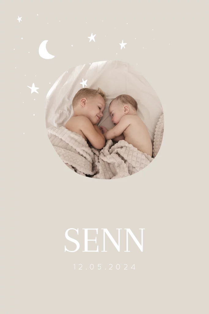 Beige geboortekaartje met foto in cirkel en gouden maan en sterren