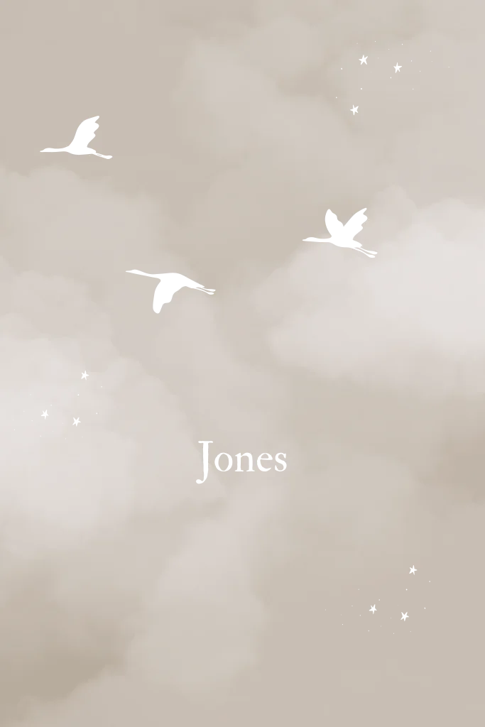 Een dromerig beige geboortekaartje met zachte wolken, kraanvogels en sprankelende sterren. Dit elegante ontwerp kan worden gepersonaliseerd met de naam van je baby en is perfect voor een bijzondere en sfeervolle geboorteverklaring. Jones