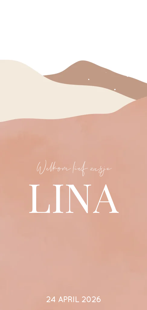 Verwelkom het nieuwe zusje met dit prachtige geboortekaartje met roze bergen en goudfolie. De bergen zijn subtiel getekend en geven een rustgevende sfeer aan de kaart. De naam van het pasgeboren meisje staat in een mooi strak lettertype en is gedrukt in glanzend goudfolie. Het contrast tussen het roze van de bergen en de gouden letters zorgt voor een luxueuze uitstraling van de kaart. Dit geboortekaartje is perfect voor de ouders die op zoek zijn naar een mooie, rustige en elegante kaart om de geboorte van hun dochter aan te kondigen. Bestel dit kaartje en deel het heuglijke nieuws op een stijlvolle en bijzondere manier met familie en vrienden. Lina