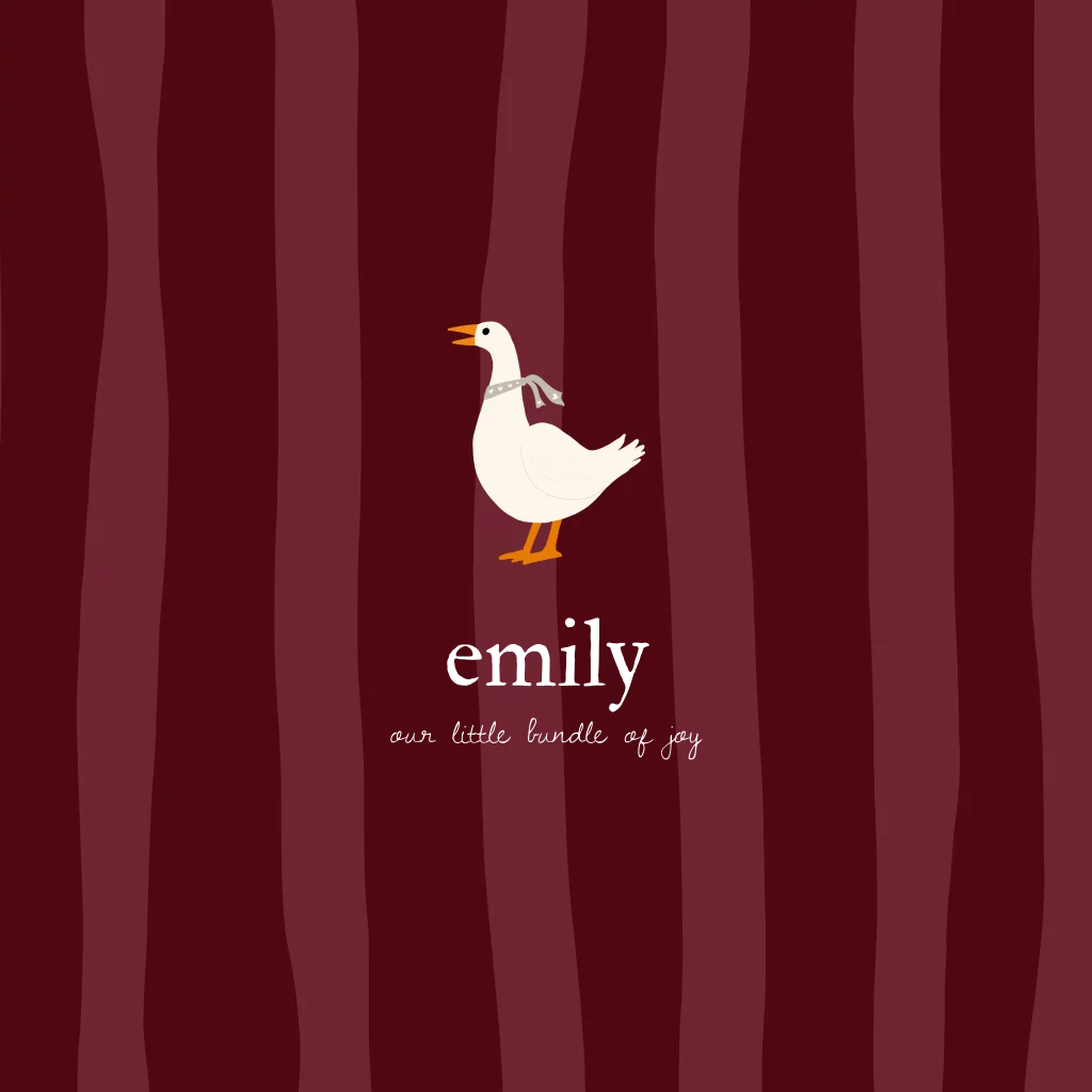 Dit stijlvolle geboortekaartje combineert diepe bordeauxrode tinten met speelse strepen en een schattig eendje. De vierkante vorm geeft het kaartje een moderne en unieke uitstraling. Emily
