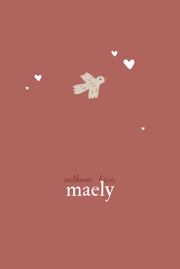 Ontdek dit prachtige donkerroze geboortekaartje met een lief vogeltje en schattige hartjes in foliedruk. Dit kaartje is perfect om de komst van jullie kleintje aan te kondigen en laat zien hoeveel liefde jullie voelen voor jullie kleine wonder. Het is ideaal voor ouders die willen laten zien hoe speciaal en bijzonder hun dochtertje is. De illustratieve elementen, zoals het vogeltje en de hartjes, geven het kaartje een natuurlijke uitstraling die perfect past bij ieder seizoen. De folie accenten voegen een vleugje elegantie toe aan het kaartje en maken het extra bijzonder. Dit geboortekaartje straalt warmte, liefde en geluk uit en zal zeker de eerste warme felicitaties uitlokken. Het is een prachtige manier om jullie familie en vrienden te laten weten dat jullie kleintje op komst is. Met de combinatie van de lieflijke illustraties, de foliedruk en de warme kleuren is dit geboortekaartje een echte eyecatcher. Het is een uniek en persoonlijk kaartje dat perfect past bij de aankondiging van jullie dochtertje. Kies voor dit prachtige donkerroze geboortekaartje met foliedruk en laat het de aankondiging van jullie kleintje nog specialer maken. Maely