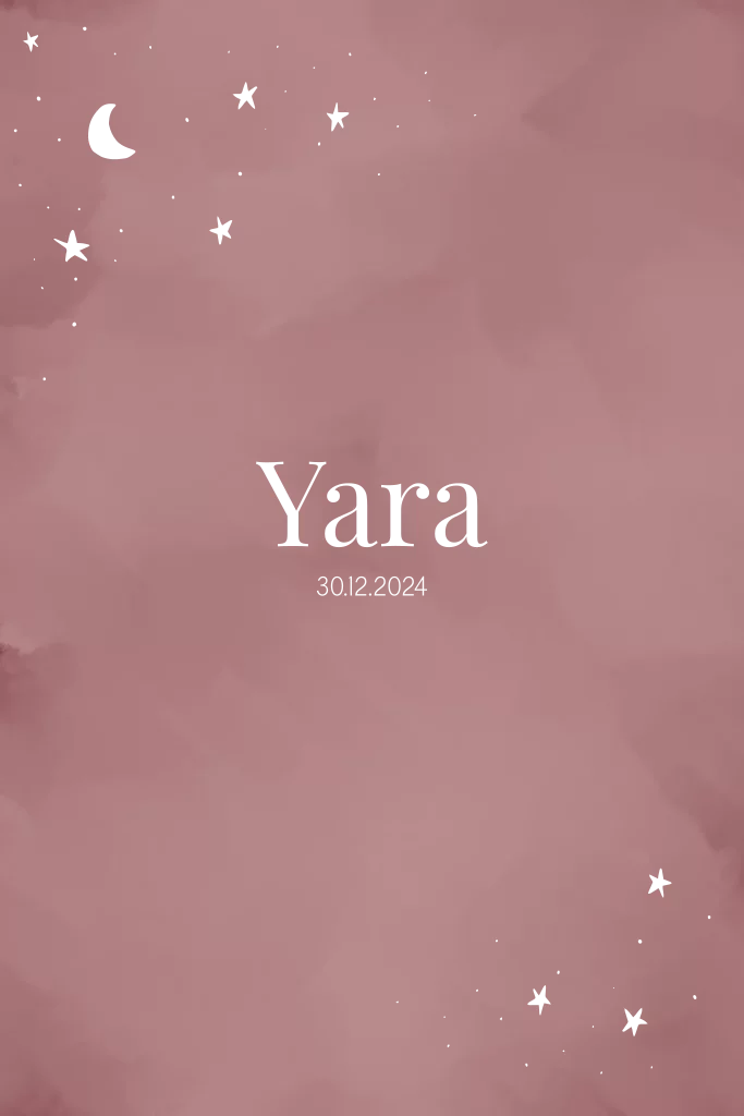 Dit magische geboortekaartje in diep donkerroze tinten heeft een sfeervol waterverfdesign met een maan en twinkelende sterren. Perfect voor een dromerige en sprookjesachtige geboorteaankondiging. Yara