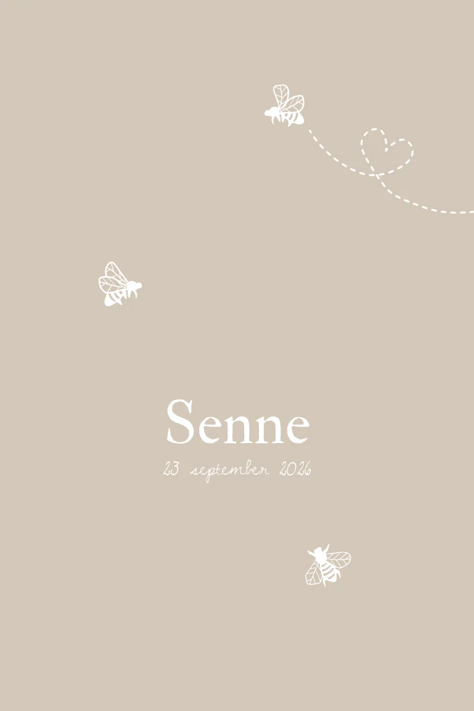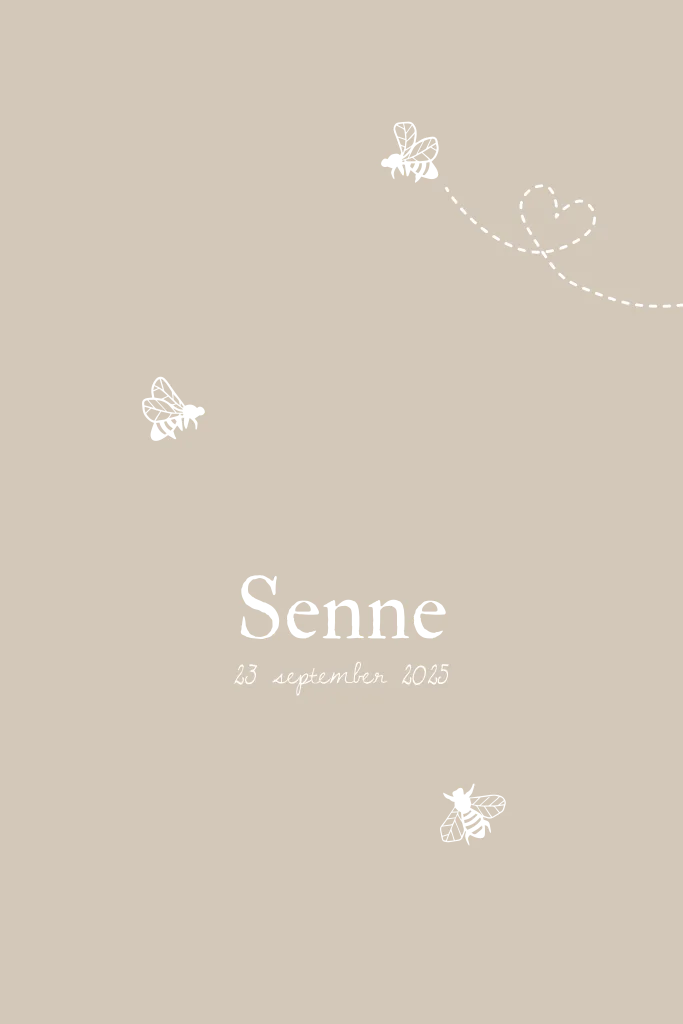 Een lief beige geboortekaartje met kleine bijtjes in glanzende goudfolie. Simpel, schattig en een beetje chic. Senne