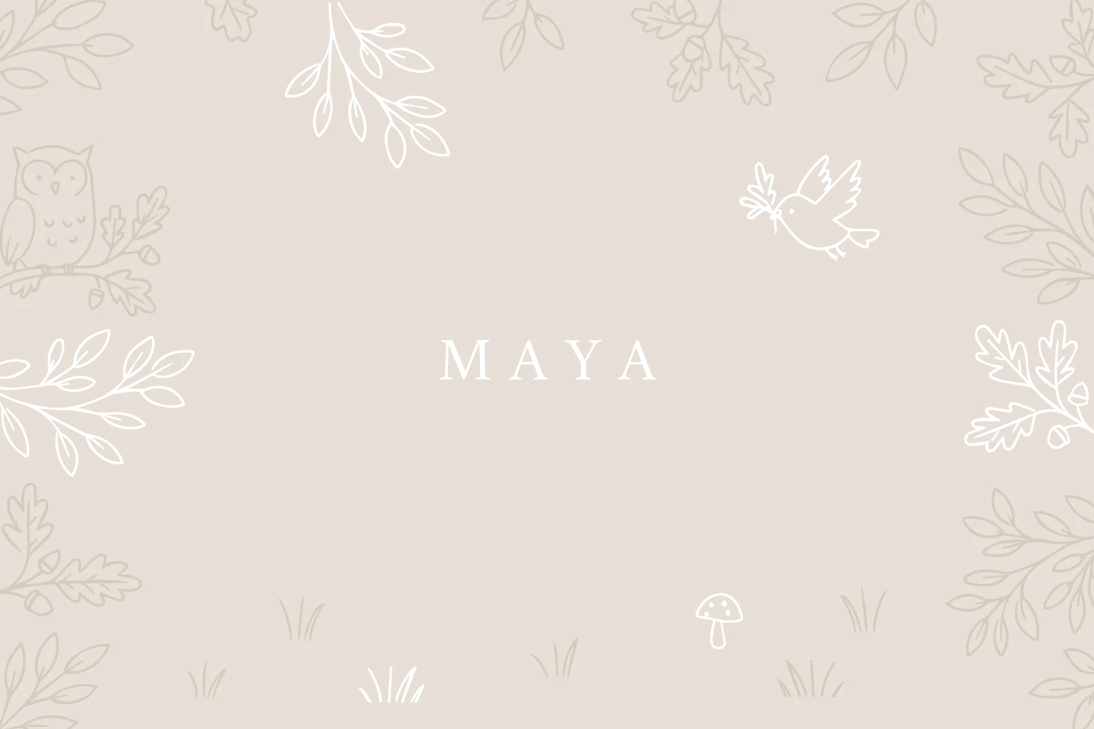 Een lief geboortekaartje met bosdieren in geel-groen. Pas het ontwerp eenvoudig aan in onze online editor. Maya