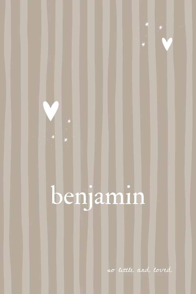 Lief beige kaartje met smalle streepjes en een regen van kleine hartjes. Simpel en warm. Benjamin