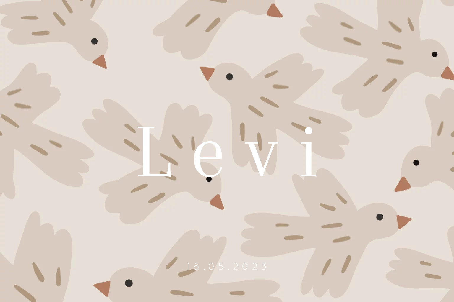 Vier de geboorte van jullie baby met dit elegante beige geboortekaartje! Versierd met prachtige vogels en luxe goudfolie accenten, is het perfect om vrienden en familie te laten weten dat jullie kleintje er is. Bestel nu en maak van deze bijzondere aankondiging een onvergetelijke herinnering! Levi