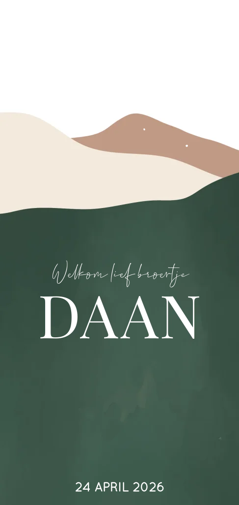 Dit hippe geboortekaartje is speciaal ontworpen voor jouw kleine jongetje. Een geboortekaartje in langwerpig ontwerp met bergen en goudfolie. De tekst 'welkom lief broertje' kan natuurlijk ook aangepast worden. De achtergrond, het lettertype en de kleuren zijn volledig naar wens aan te passen. Heb je hulp nodig bij het ontwerpen van jouw ideale kaartje? Stuur gerust een berichtje! Daan