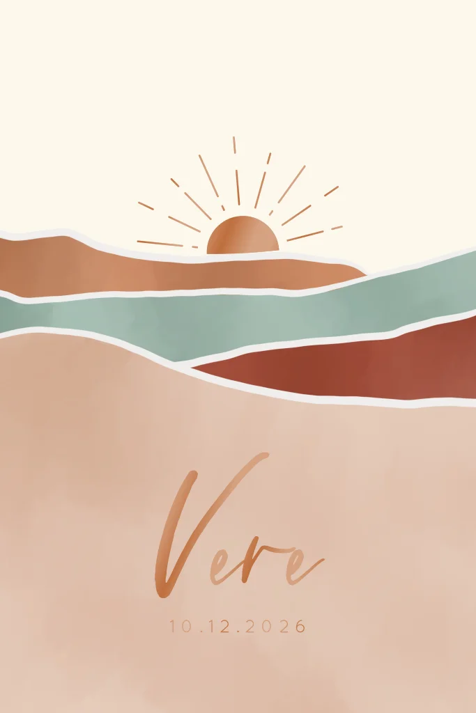 Dit unieke geboortekaartje heeft een kleurrijke illustratie van bergen met daarboven een prachtige zon. De zon is gedrukt in koperfolie, wat voor een luxe uitstraling zorgt. De vrolijke kleuren van de bergen maken het kaartje perfect voor een zomerse geboorte. Personaliseer het kaartje met de gegevens van jullie pasgeboren kindje en verstuur het naar jullie dierbaren om het heugelijke nieuws te delen. Pas dit geboortekaartje met zon eenvoudig aan in onze digitale editor. Wil je andere kleuren? Stuur gerust een berichtje. Vere