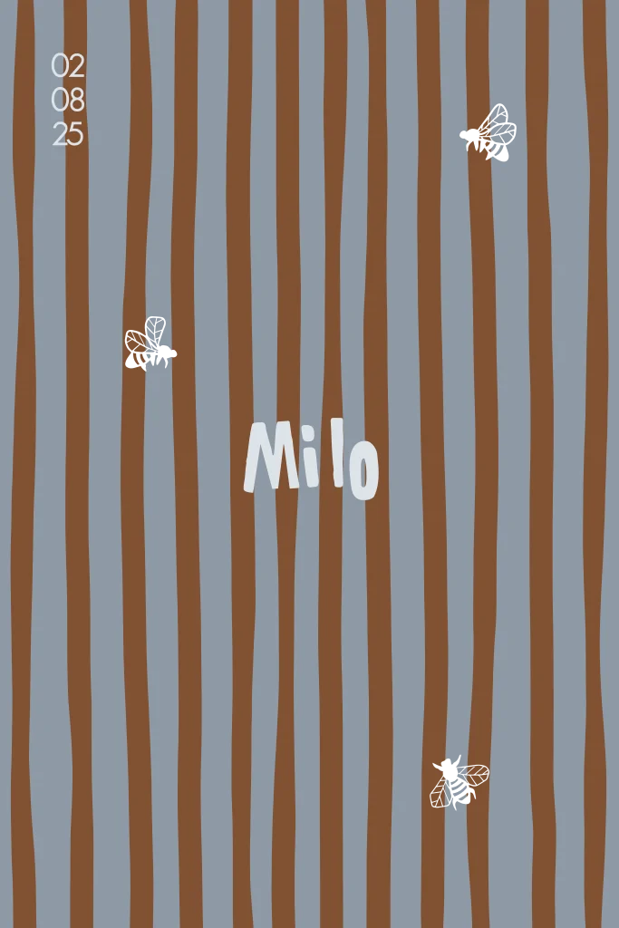 Een stoer gestreept kaartje in blauw en bruin met kleine gouden bijtjes. Lief én luxe. Milo