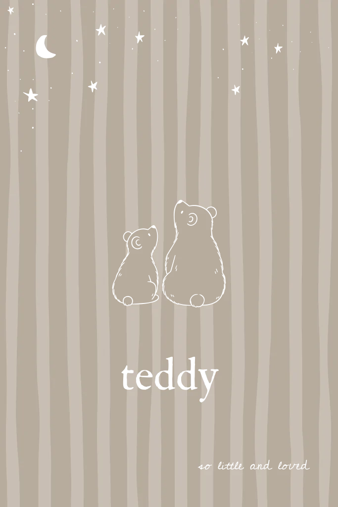Gestreept geboortekaartje met beertjes kijkend naar de sterren