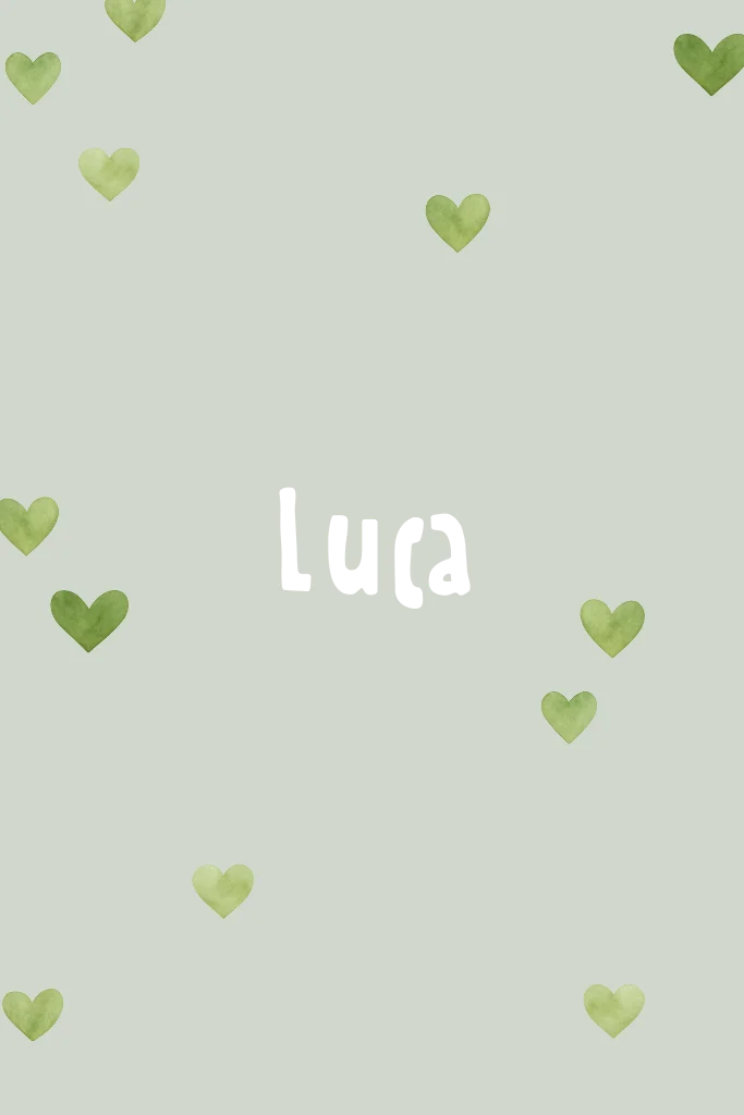 Fris groen geboortekaartje met zachte waterverf hartjes. Eenvoudig, lief en een tikje speels. Luca