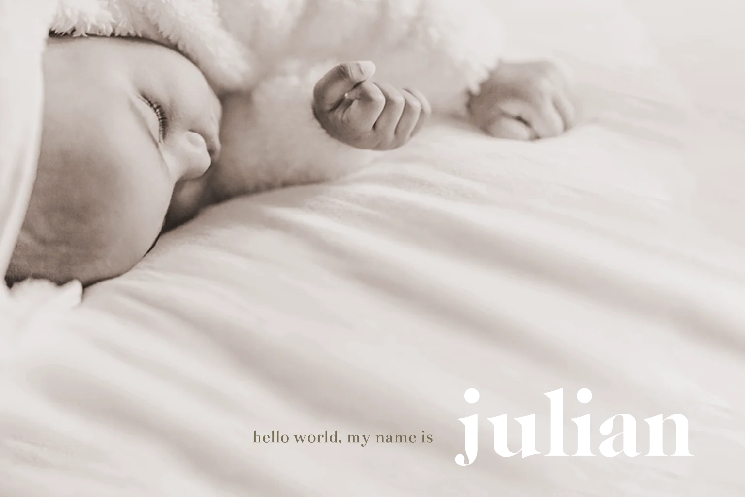 Dit geboortekaartje met foto is super sjiek! De naam van jullie kleintje staat groot en glanzend in goudfolie. De foto van jullie baby is het stralende middelpunt en zorgt voor een grote glimlach. Het kaartje is helemaal speciaal met die mooie gouden naam erop. Je kunt alle geboortegegevens erbij zetten, zodat iedereen kan zien hoe trots jullie zijn op jullie kleintje. Het is echt een prachtige aankondiging van jullie bijzondere wonder!