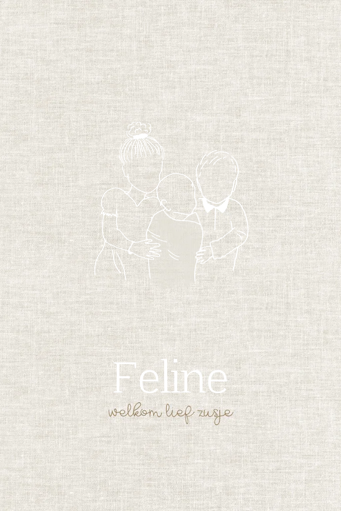 Dit geboortekaartje met een lieve lijntekening van een broertje en zusje is perfect om de geboorte van jullie nieuwe kindje aan te kondigen. De tekening straalt warmte en gezelligheid uit en laat zien dat het nieuwe broertje of zusje al volledig opgenomen is in het gezin. Dit kaartje is ideaal voor ouders die graag een persoonlijke en betekenisvolle touch willen toevoegen aan hun geboortekaartje. De lijntekening is simpel, maar heeft toch een charmante en unieke uitstraling. De combinatie van de tekening en de mooie typografie zorgen voor een stijlvol en tijdloos geboortekaartje dat zeker bij de ontvangers in de smaak zal vallen. Feline