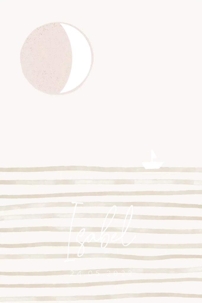Dit moderne geboortekaartje met zee, bootje én maanstand (in goudfolie) van de geboortedatum van jouw kleintje. Een neutraal kaartje en daarom leuk voor zowel jongens als meisjes.