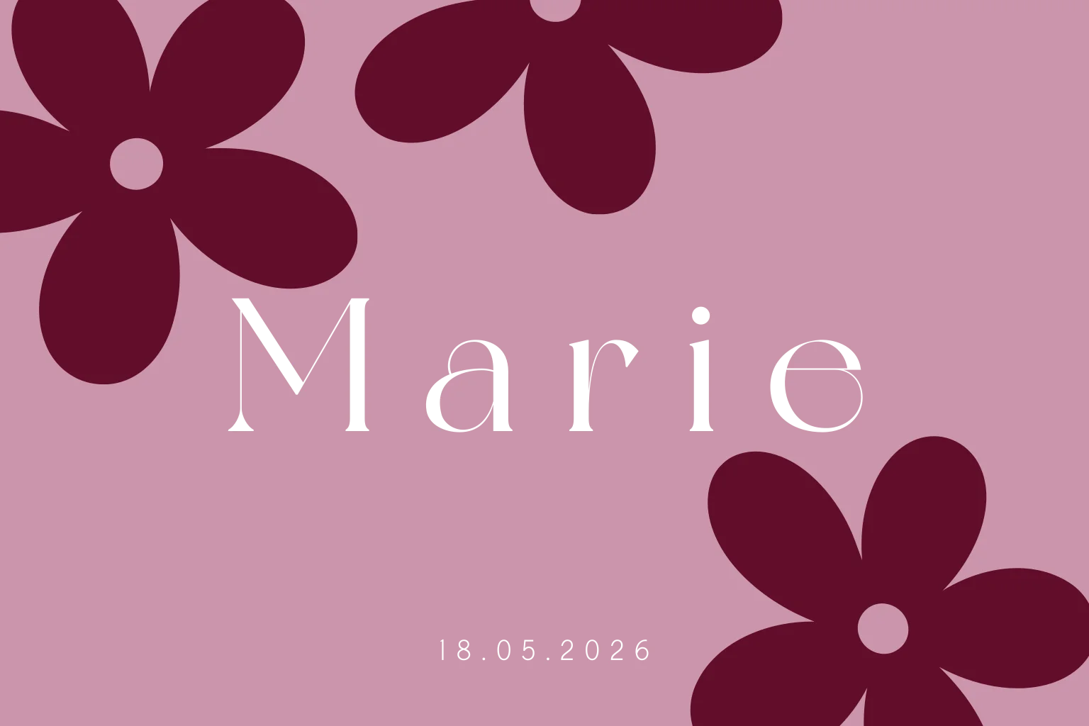 Lief roze geboortekaartje met bordeauxrode bloemen en een naam in roségouden folie. Zacht, warm en feestelijk. Pas het ontwerp naar wens aan in de editor. Heb je hulp nodig? Stuur me gerust een berichtje, ik help je graag! Marie
