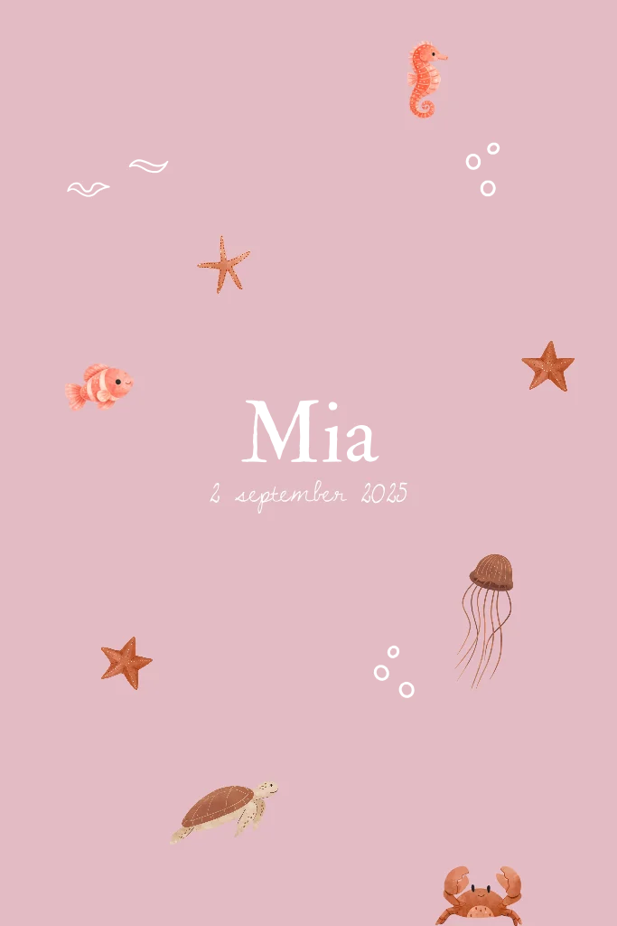 Vrolijk roze geboortekaartje met visjes, zeesterren en een lief zeepaardje. Speels, kleurrijk en helemaal zee-thema. Pas het ontwerp naar wens aan in de editor. Heb je hulp nodig? Stuur me gerust een berichtje, ik help je graag! Mia